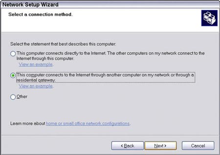 You can connect your network to the Internet in one of two basic ways: Through an Internet device connected to your Broadband router, or via an Internet device connected to one of your networked computers. For reasons we explain in Chapter 3, connecting through an Internet device connected to your Broadband router is the preferred method. The Network Setup Wizard asks you a question on the third screen about how you connect to the Internet, as shown in Figure 2-7.
