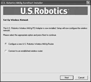 - Po wyświetleniu odpowiedniego monitu wybierz opcję Configure a new USRobotics Wireless MAXg Router (Skonfiguruj nowy router Wireless MAXg firmy USRobotics) i kliknij przycisk Next. Musisz chwilę zaczekać, aż karta Wireless MAXg PCI Adapter nawiąże komunikację z routerem.