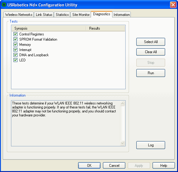 في ناحية Diagnostics (تشخيصات)، تستطيع تنفيذ سلسلة من الاختبارات على Wireless Ndx أو PCI Adapter، وعلى اتصالك اللاسلكي.