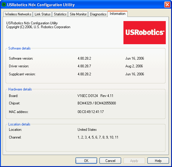 في ناحية Information (المعلومات)، يمكنك الاطلاع على معلومات الإصدار الخاصة بـ your Wireless Ndx PC Card أو بـ PCI Adapter.