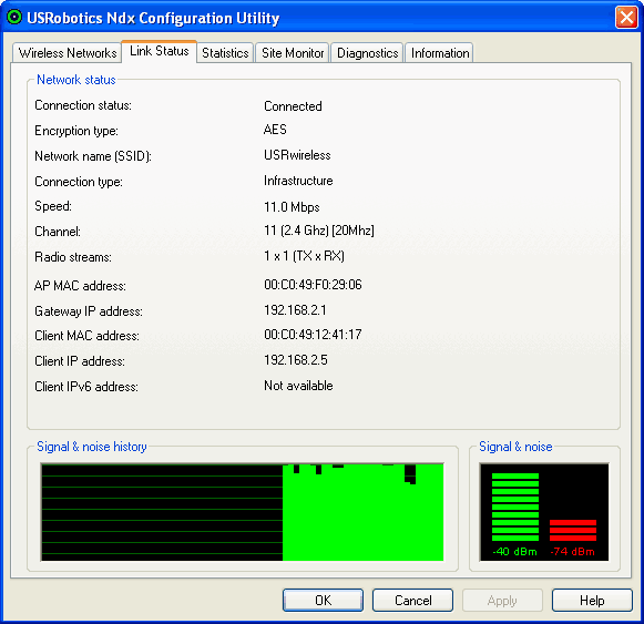 في منطقة Link Status (حالة الاتصال)، يتم عرض المعلومات الخاصة بالاتصال اللاسلكي الحالي.