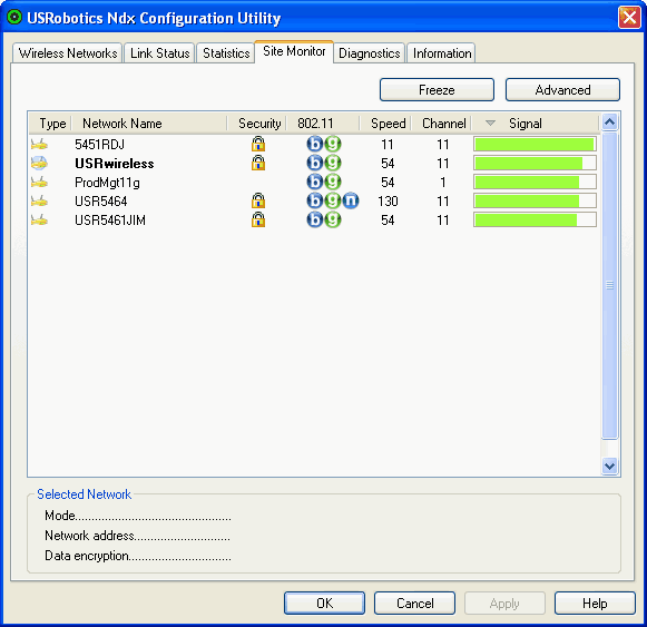 في Site Monitor (مراقبة الموقع)، يمكنك عرض أجهزة الشبكة اللاسلكية التي تستطيع Wireless Ndx PC Card أو PCI Adapter الاتصال بها. وإذا أردت الاتصال بأحد الأجهزة التي تظهر في القائمة، اذهب إلى منطقة الشبكات اللاسلكية.