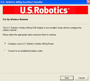 - Wanneer er een bericht verschijnt nadat uw computer opnieuw is opgestart, selecteert u Configure a new U.S. Robotics Wireless MAXg Router (Een nieuwe U.S. Robotics Wireless MAXg Router configureren) en klikt u op Volgende. U dient even te wachten terwijl de USB Adapter met de router communiceert.