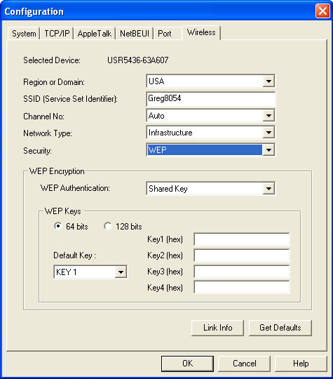 Bei Wahl von WEP müssen Sie unter WEP Authentication eine Authentifizierungsmethode wählen. Zur Auswahl stehen Open System und Shared Key. Wählen Sie anschließend entweder 64 Bit oder 128 Bit als Schlüsselgröße aus. Nach dieser Auswahl geben Sie bis zu vier Schlüssel ein. Wenn Sie 64 Bit ausgewählt haben, muss jeder Schlüssel aus zehn Zeichen bestehen. Wenn Sie 128 Bit ausgewählt haben, muss jeder Schlüssel aus 26 Zeichen bestehen. HEX-Werte (hexadezimal) sind A-F und 0-9. Als Nächstes müssen Sie den Default Key (Standardschlüssel) angeben. Dieser Schlüssel wird für die Verschlüsselung verwendet. Die anderen Schlüssel dienen zur Entschlüsselung.