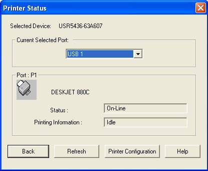 Wenn Sie nach der Auswahl eines Wireless USB Print Servers auf diese Schaltfläche klicken, wird ein neues Fenster geöffnet, in dem der Status des Druckers angezeigt wird. Wählen Sie den gewünschten Anschluss in der Dropdown-Liste, um den aktuellen Status des Druckers anzuzeigen, der mit diesem Anschluss verbunden ist. Für den Status gibt es folgende Optionen: On-Line (Online), Off-Line (Offline) und Out of Paper (Kein Papier). Die möglichen Zustände für das Drucken von Informationen sind Idle (Leerlauf) oder Printing (Druckt).