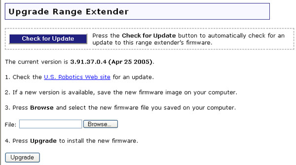 Yeni ya da güncellenmiş özellikler mevcutsa bellenimin yeni sürümleri oluşturulur. Wireless MAXg Range Extender'ın bellenimi için herhangi bir bellenim güncellemesi olup olmadığını görmek isterseniz, aktif bir Internet bağlantınız olduğundan emin olun ve Check for Update (Güncellemeleri Kontrol Et) düğmesini tıklatın. Wireless MAXg Range Extender, USRobotics Web sitesine gidecek ve güncellemeleri otomatik olarak kontrol edecektir.