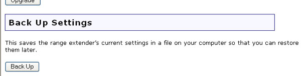 İstediğiniz zaman bu alana gelerek Back Up (Yedekle) düğmesini tıklatabilirsiniz. Bu işlem, Wireless MAXg Range Extender'ın mevcut ayarlarının bulunduğu bir dosya yaratır. Bu yedekleme işlemi, eğer Range Extender'ın çeşitli ayarlarında önemli miktarda değişiklik yapmayı planlıyorsanız ve sorun yaşadığınızda güvenebileceğiniz bir sürüme geri dönmek istediğiniz zaman elinizde böyle bir dosya bulunduğundan emin olmak istiyorsanız yararlı olabilir. Ayarlar dosyasını, ileride bulmanız gerektiğinde hatırlayabileceğiniz bir konumda sakladığınızdan emin olun. Bu dosyayı hiçbir şekilde değiştirmeyin.