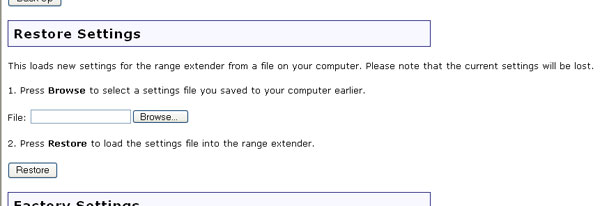 Eğer ayarlarınız fabrika ayarlarına geri yüklendiyse veya ayarlarınız değişti ve Range Extender düzgün şekilde çalışmıyorsa, oluşturmuş olduğunuz yedek dosyadan kaydedilmiş ayarlarınızı geri yüklemek için bu alana gelebilirsiniz. Daha önceden yaratmış olduğunuz yedekleme ayarları dosyasını bulmak için Browse (Gözat) düğmesini tıklatın. Dosyayı bulduğunuz zaman, Restore (Geri Yükle) düğmesini tıklatın. Bu dosyada yer alan ayarlar Range Extender'a uygulanacaktır. Eğer yedek bir dosya oluşturmadıysanız ve Range Extender düzgün çalışmıyorsa fabrika varsayılan ayarlarını geri yüklemeniz gerekebilir.