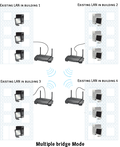 El modo Multiple Bridge es similar al modo Wireless Bridge, pero se usa para conectar por vía inalámbrica más de dos redes de área local en uso y con cableado (LAN). Al conectar un Wireless Access Point a cada LAN y seleccionar el modo Multiple Bridge, los diferentes Wireless Access Points se comunicarán entre sí, creando una conexión segura entre las distintas redes.