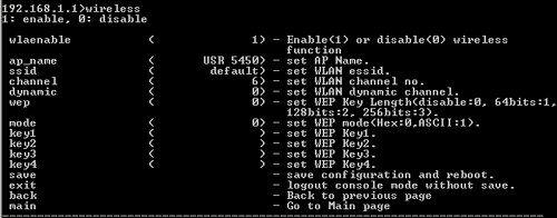 Para ver las opciones de la red inalámbrica, escriba "wireless" (inalámbrica) y pulse INTRO. Las opciones son: wlaenable, ap_name, ssid, channel, dynamic y wep.