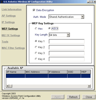 Ekranın üstündeki onay kutusunu seçerek Veri Şifreleme komutunu etkinleştirebilirsiniz. Bu komutu seçerseniz, bunun ardından bir Ağ Anahtarı girmeniz gerekecektir. Açılan anahtar formatı menüsünden HEX veya ASCII'yi seçmeniz gerekecektir. Kimlik Denetimi seçeneğinin yanında açılan menüyü seçerek kimlik denetimi modunu değiştirebilirsiniz. Mod. Üç seçenekten birini seçebilirsiniz: Auto Switch (Otomatik Kapama), Open Authentication(Kimlik Denetimini aç), veya Shared Authentication (Paylaşılan Kimlik denetimi). Şifrelemeyi etkinleştirdiğinizde, birden dörde kadar, WEP Ağ anahtarlarını seçmeniz ve girmeniz ve 64 bit, 128 bit, veya 256 bit seçenekleri arasından Anahtar Genişliğini seçmeniz gerekecektir.