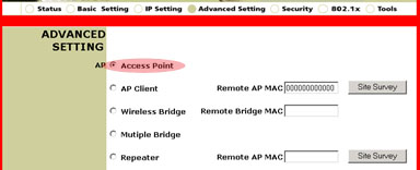 Not: Erişim Noktası İstemci modunu da Yineleyici modunu da seçseniz, her iki koşulda da Uzak AP MAC Adresini girmeniz gerekecektir. Uzak AP MAC Adreslerinin hepsini orijinal bir ayar olan sıfıra ayarlarsanız, 802.11g Kablosuz Turbo Çok fonksiyonlu Erişim Noktası mevcut herhangi bir istemci ile ilişkilendirilecektir.
