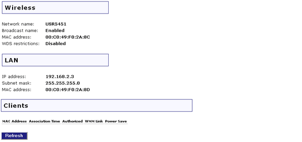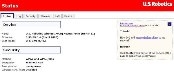 На странице Status (Состояние) можно просмотреть все текущие сведения, относящиеся к беспроводной точке доступа Wireless MAXg Access Point.