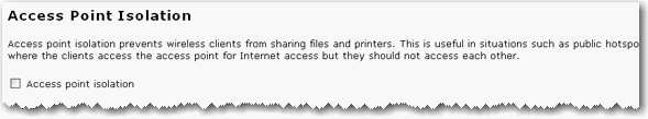 Εάν το σημείο πρόσβασης πρόκειται να χρησιμοποιηθεί σε δημόσιο χώρο και δεν θέλετε να επιτρέψετε την κοινή χρήση αρχείων και εκτυπωτών από άλλους ασύρματους πελάτες, επιλέξτε τη ρύθμιση Access point isolation (Απομόνωση σημείου πρόσβασης). Εάν την επιλέξετε, όλοι οι ασύρματοι πελάτες θα έχουν πρόσβαση στο Διαδίκτυο μόνον. Ένα παράδειγμα περίπτωσης στην οποία πιθανόν να θέλετε να ενεργοποιήσετε τη δυνατότητα αυτήν είναι σε δημόσια σημεία ελεύθερης πρόσβασης (hotspots), όπως σε καφετέριες ή ξενοδοχεία. Η δυνατότητα αυτή είναι απενεργοποιημένη κατά προεπιλογή.