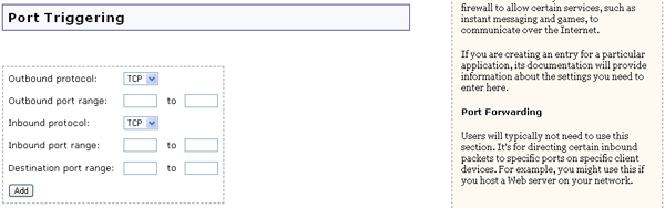 Einige Anwendungen stellen eine Internet-Verbindung über einen oder mehrere Ausgangsanschlüsse her und erwarten eine Antwort über einen oder mehrere Eingangsanschlüsse. Die Anschlussweiterleitung konfiguriert die Firewall so, dass die Antwort(en) die Client-Geräte erreichen kann/können. Bestimmte Anwendungen können nicht mit dem Router zusammenarbeiten, da alle Anschlüsse standardmäßig blockiert sind.