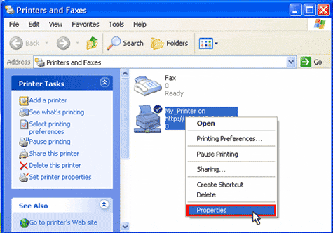 - Klicken Sie mit der rechten Maustaste auf My_Printer on http://192.168.2.1:1631 (Mein_Drucker an http://192.168.2.1:1631) und klicken Sie auf Properties (Eigenschaften).