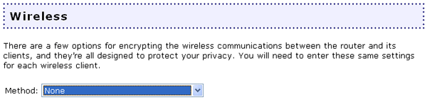 W przypadku wybrania opcji None (Brak) nie zostanie włączone żadne szyfrowanie komunikacji bezprzewodowej w sieci.