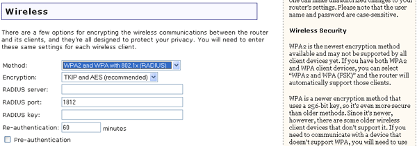 Po wybraniu opcji WPA and WPA2 with 802,1x (RADIUS), WPA2 with 802,1x (RADIUS) lub WPA with 802,1x (RADIUS) należy w polu RADIUS Server (Serwer RADIUS) wprowadzić informacje dotyczące serwera RADIUS. Jest to komputer, z którym router Wireless MAXg Router tworzy bezpośrednie połączenie i uwierzytelnia użytkownika lub połączenie bezprzewodowe. Wprowadź adres IP serwera RADIUS. W polu RADIUS Port (Port RADIUS) można wprowadzić numer portu lub użyć portu domyślnego 1812. Następnie należy w polu RADIUS Key (Klucz RADIUS) prowadzić klucz RADIUS. Może to być słowo lub zbiór liczb, które będą używane jako zabezpieczenie dodatkowe. Każdy klient bezprzewodowy 802.1X łączący się z routerem Wireless MAXg Router będzie musiał mieć poprawny klucz RADIUS, ponieważ inaczej zostanie odrzucony. Czas ponownego uwierzytelnienia (w minutach) należy wprowadzić w polu Re-authentication (Ponowne uwierzytelnienie). Określa on, jak często router będzie wysyłał wiadomość i wymagał, aby klienci wysłali w odpowiedzi poprawną informację zabezpieczeń. Na koniec można wybrać opcję Pre-authentication (Uwierzytelnianie wstępne). Włączając tę opcję, można uwierzytelnić klienta bezprzewodowego znajdującego się w zasięgu innych punktów dostępu bezprzewodowego, podczas gdy ten klient nadal komunikuje się za pośrednictwem swojego aktualnego punktu dostępu bezprzewodowego.