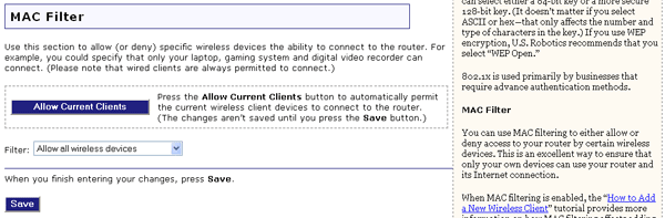 Po kliknięciu przycisku Allow Current Clients (Zezwalaj na dostęp obecnych komputerów klienckich) wszystkie bezprzewodowe komputery klienckie aktualnie podłączonej do routera Wireless MAXg Router będą mogły w przyszłości uzyskiwać dostęp do routera.