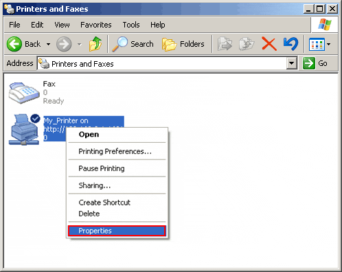 Clique com o botão direito do rato na impressora e seleccione Propriedades.