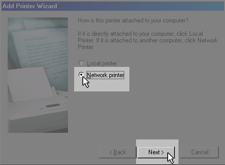 Επιλέξτε το κουμπί επιλογής Network printer (Εκτυπωτής δικτύου). Κάντε κλικ στην επιλογή Next (Επόμενο).