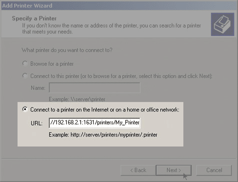 Not: URL bilgileri büyük-küçük harf duyarlıdır ve aynen yönelticinin Status (Durum) sayfası Printer location (Yazıcı konumu) bölümünde listelendiği gibi girilmelidir. Eğer yönelticinizin IP adresini değiştirdiyseniz, 192.168.2.1 yerine yeni adresi kullanın.
