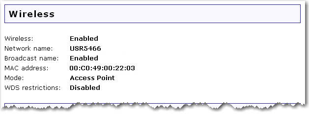 Broadcast name (Όνομα εκπομπής): Προβάλλει εάν η εκπομπή του ονόματος δικτύου είναι Enabled (Ενεργοποιημένη) ή Disabled (Απενεργοποιημένη). Αυτό μπορεί να διαμορφωθεί από τη σελίδα Wireless (Ασύρματο).