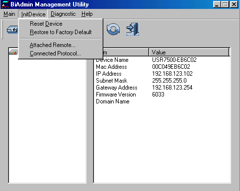 - Befindet sich der gesuchte USB Print Server in einem anderen LAN-Segment, öffnen Sie das Menü InitDevice (Gerät initiieren) und klicken Sie dann auf Attach (Anschließen), um den USB Print Server zu finden und anzuzeigen.