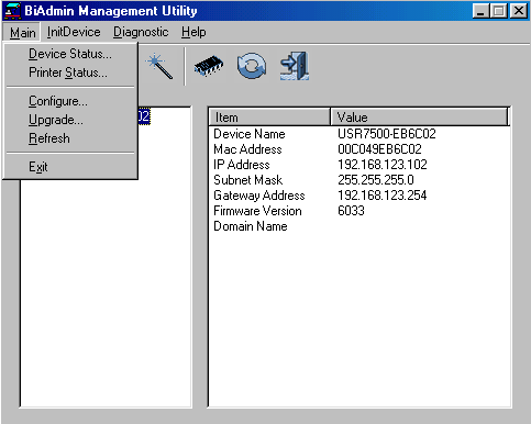 Oben im Hauptbildschirm des Verwaltungs-Dienstprogramms Bi-Admin befindet sich die Menüleiste mit folgenden vier Menüs: Main (Hauptmenü),InitDevice (Gerät initiieren), Diagnostic (Diagnose) und Help (Hilfe).