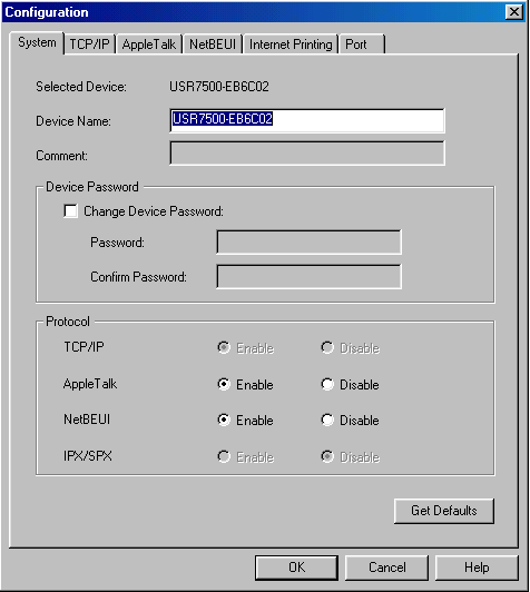 Le premier onglet est System. Dans cet écran, vous pouvez changer le nom et le mot de passe de l'USB Print Server, et paramétrer les protocoles de réseau qu'utilise l'USB Print Server choisi. Tout protocole non utilisé sur votre réseau local (LAN) peut être désactivé, ce qui peut améliorer les performances.