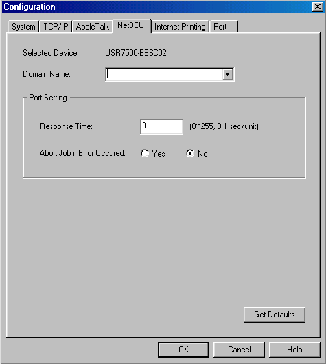Si vous cliquez sur le bouton de Configuration, une nouvelle fenêtre contenant différents onglets pour les diverses options de configuration s'ouvrira. Les différents onglets sont les suivants : System, TCP/IP, AppleTalk, NetBEUI, Internet Printing et Port. Chaque onglet a une option correspondante sous Main (Principal) dans la liste de menu en haut de l'écran principal de l'utilitaire d'administration Bi-Admin.