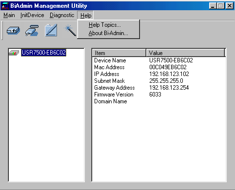 En haut de l'écran principal de l'utilitaire d'administration Bi-Admin, une barre de menu présente quatre options : Main, InitDevice, Diagnostic et Help.