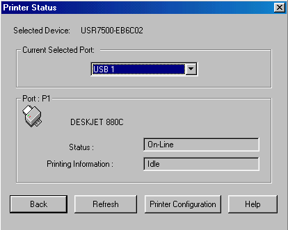 L'icône suivante est Refresh. Si vous modifiez la configuration de l'USB Print Server, choisissez cette icône pour afficher les nouveaux paramètres.