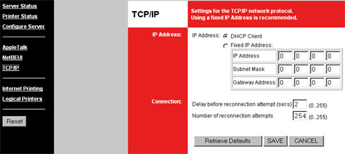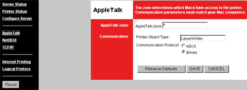 In this area you can determine what Apple systems can access the printer by entering them in the AppleTalk Zone. You can also view and change the Printer Object Type, which describes the printer driver that is used for the established printer port. The last thing you can change in this area is the Communication Protocol. You can select either ASCII or Binary. If you make any changes in this area, you must click Save at the bottom of the page in order for the changes to take effect. You can also click Retrieve Defaults to restore the default settings for this area.