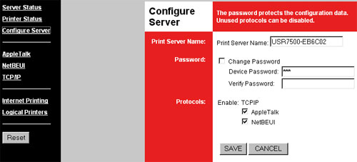 In the Configure Server page, you can modify the settings of the USB Printer Server. If you make any changes in this area, you must click Save at the bottom of the page in order for the changes to take effect. The first thing you can change is the name of the Print Server. The new name cannot contain any blank spaces. Next, you can click the checkbox to either enable or change the password. If you enable or change the password, you will need to enter the password in the Change Password field and in the Verify Password field. The last thing you can do on this page is click the checkboxes to either enable or disable AppleTalk and NetBEUI. If the boxes are checked, these features will be enabled.