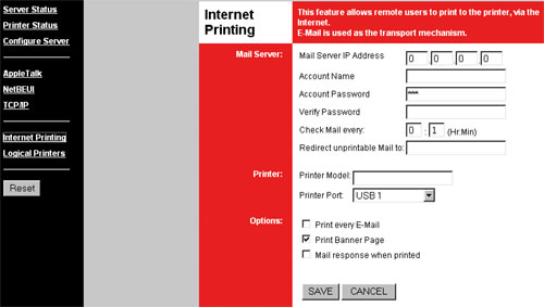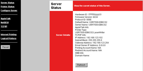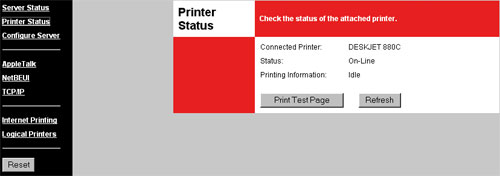 Web Configuration UtilityThe following section describes the various functions of the Web Configuration Utility. This utility provides quick access to all the settings of the USB Print Server. You can access the Web Configuration Utility by opening a Web browser and typing the IP address of the USB Print Server. If you do not know the IP address of the USB Print Server, print a copy of the diagnostic page. The IP address is among the information provided in the diagnostic page. When the Web Configuration Utility has opened, you will see menu options on the left-hand side. There are eight options: Server Status, Printer Status, Configure Server, AppleTalk, NetBEUI, TCP/IP, Internet Printing, and Logical Printers. Server Status