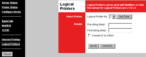 The USB Print Server can be used with Netware and Unix if the printer is set up as a logical printer. Select the Logical Printer Port you wish to configure. You can choose either L1, L2, or L3. Click the Get Data button to show the current data for the selected logical printer. Pre-string is the printer control string in hexadecimal characters to be sent to the printer before each print job. This string cannot exceed 15 characters. Post-string is the printer control string in hexadecimal characters to be sent to the printer after each print job. This string cannot exceed 15 characters.