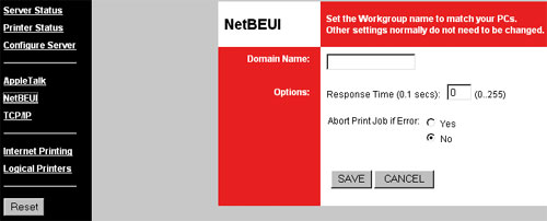 In the NetBEUI area, you can enter the Domain Name for your network. You can set the Response Time for between 0 and 255 seconds. This determines how fast print jobs are sent to the printer. You can also select Yes or No for Abort Print Job if Error. This will set whether or not a print job will be cancelled if any errors are encountered. If you make any changes in this area, you must click Save at the bottom of the page in order for the changes to take effect.