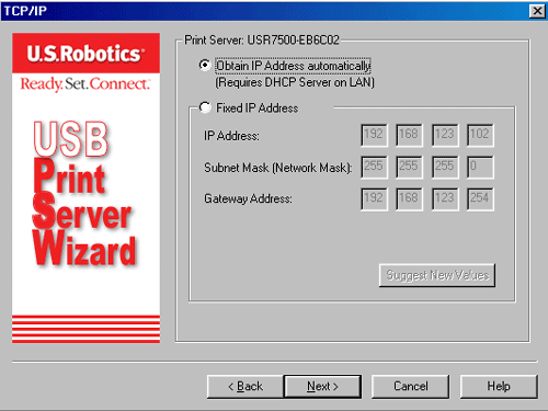 USB Print Server is set to Dynamic IP Address, but there's no DHCP server