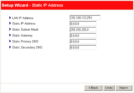 إذا كان نوع شبكة WAN الخاصة بك هو عنوان IP ثابت، فسوف ينقلك معالج الإعداد إلى المعلومات التالية.