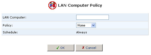 Aplicación de las normas de filtradoPuede definir una norma de filtrado predeterminada que se aplicará a todos los dispositivos de la red doméstica o aplicar diferentes normas en cada uno de los dispositivos. Para seleccionar una norma de filtrado predeterminada, elija el nombre de la norma en el menú desplegable Default Policy (Norma predeterminada) que se encuentra en la ficha Filtering Policy (Normas de filtrado). Para aplicar normas diferentes a los distintos dispositivos de la red doméstica, siga estos pasos: 1. Haga clic en la ficha Filtering Policy (Normas de filtrado). Haga clic en Add a LAN Computer (Añadir ordenador a la LAN).