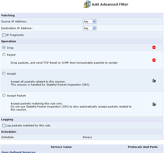 - Accept Packet (Accetta pacchetto): consente l'accesso ai pacchetti che corrispondono agli indirizzi IP di origine e di destinazione e alle porte dei servizi definite nella sezione Matching. La sessione per il trasferimento dati viene gestita utilizzando SPI (Ispezione dei pacchetti); ciò significa che agli altri pacchetti corrispondenti a questa regola non viene consentito automaticamente l'accesso. Ad esempio, ciò può risultare utile quando si creano regole che consentono la trasmissione.