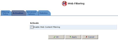 Per attivare o disattivare il filtraggio dei contenuti Web di USR8200 Firewall/VPN/NAS, attenersi alla seguente procedura: 1. Fare clic sull'icona Web-Filtering (Filtraggio Web) posta sulla barra laterale. 2. Fare clic sulla scheda Activation (Attivazione). 3. Selezionare la casella di controllo Enable Web Content Filtering (Attiva filtraggio contenuti Web). 4. Fare clic su OK.