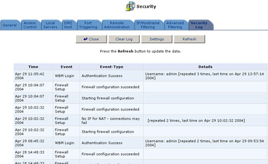 El registro de seguridad muestra una lista de todas las incidencias relacionadas con el cortafuegos, como los intentos de conexiones entrantes y salientes, los intentos de autenticación en una interfaz de control (Gestión Web o terminal Telnet), la configuración del cortafuegos o el inicio del sistema.