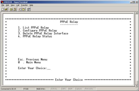 • Delete PPPoE Relay Interface (PPPoE-Relais-Schnittstelle löschen): Geben Sie im Menü PPPoE Relay (PPPoE-Relais) 3 ein. Daraufhin erscheint das Menü Delete PPPoE Relay. In diesem Menü können Sie PPPoE-Relais-Schnittstellen löschen, indem Sie einen Schnittstellennamen eingeben.