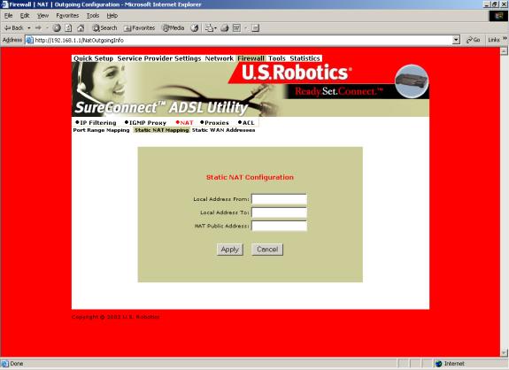 NAT - Static WAN Address Configuration (Configurazione indirizzi WAN statici)Public IP Address (Indirizzo IP pubblico) L'indirizzo IP pubblico utilizzato dal router nella traduzione degli indirizzi di rete. Per salvare e installare i dati di configurazione degli indirizzi WAN statici