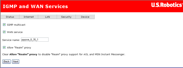 This page allows you to enable IGMP multicast, enable WAN service, specify a service name, and enable a "Reaim" proxy. After verifying and entering your settings, click Next.