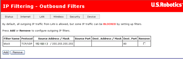 - Dans le menu Security (Sécurité), sélectionnez IP Filtering - Outbound Filters (Filtrage IP - Filtres sortants).