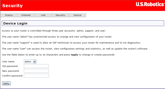 Cette page permet de modifier le mot de passe des comptes admin (administrateur), support (assistance) et user (utilisateur). (Les mots de passe par défaut sont respectivement admin, support et user.) Il vous suffit de sélectionner un compte dans la liste déroulante User name (Nom d'utilisateur) et de saisir l'ancien mot de passe, puis le nouveau. Entrez le nouveau mot de passe une deuxième fois pour confirmer. Cliquez ensuite sur Apply (Appliquer) pour enregistrer le nouveau mot de passe.