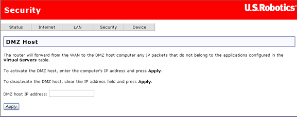 Pour configurer la zone démilitarisée, il vous suffit d'entrer l'adresse IP de l'ordinateur qui servira d'hôte DMZ. Cliquez sur Apply (Appliquer) pour enregistrer l'adresse DMZ. Pour désactiver la fonction DMZ, effacez le contenu de DMZ host IP address (Adresse IP de l'hôte DMZ) et cliquez sur Apply (Appliquer).